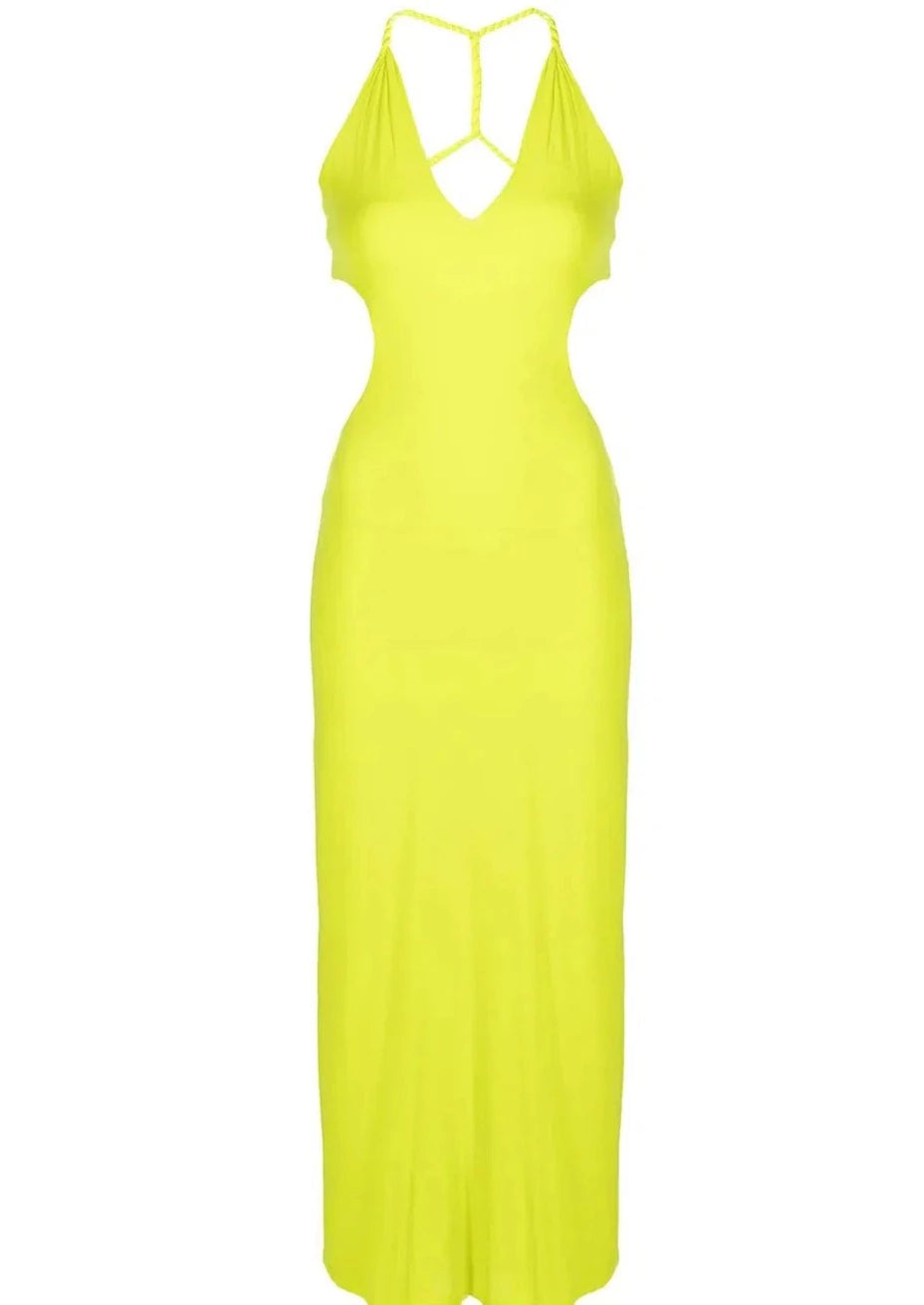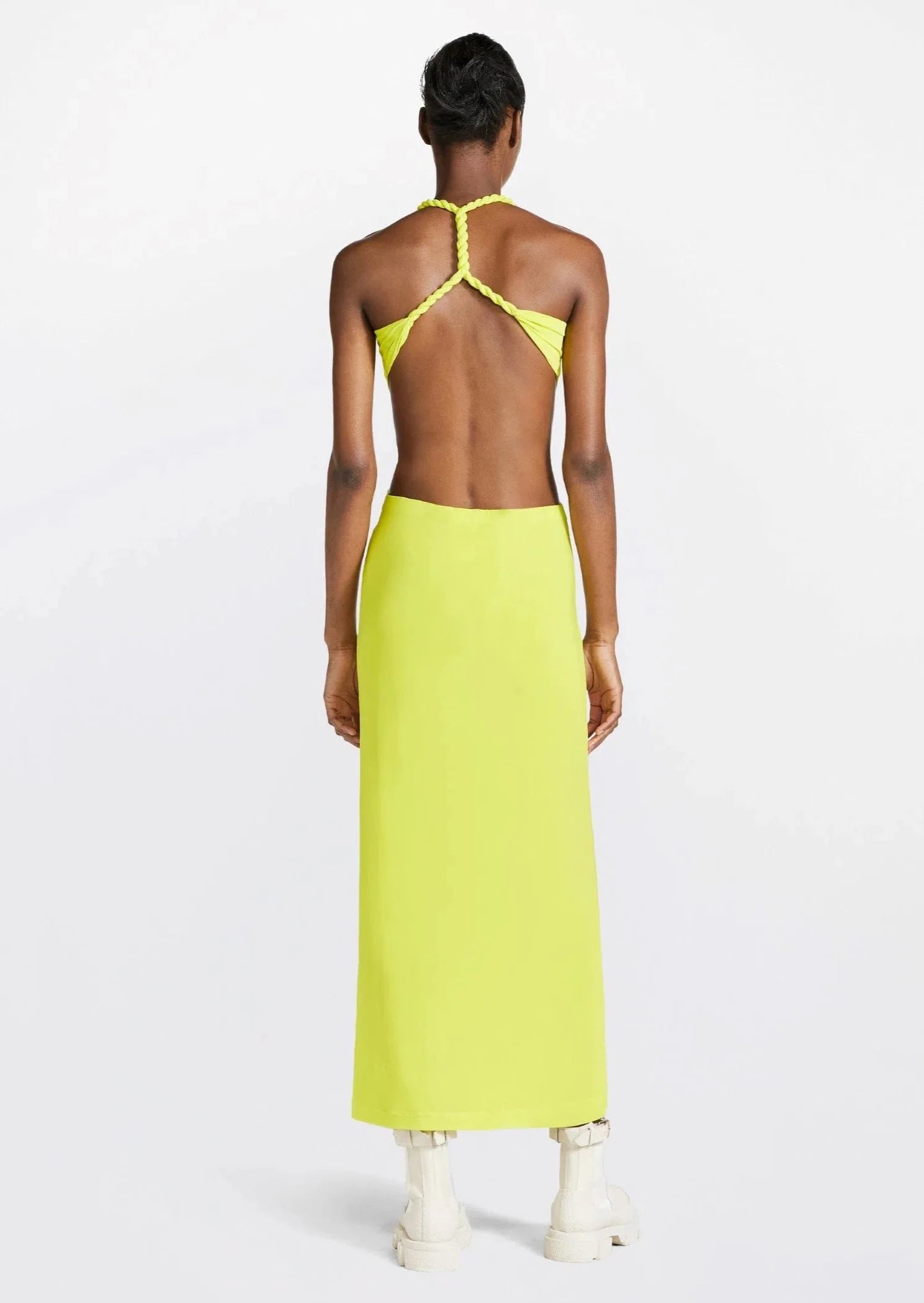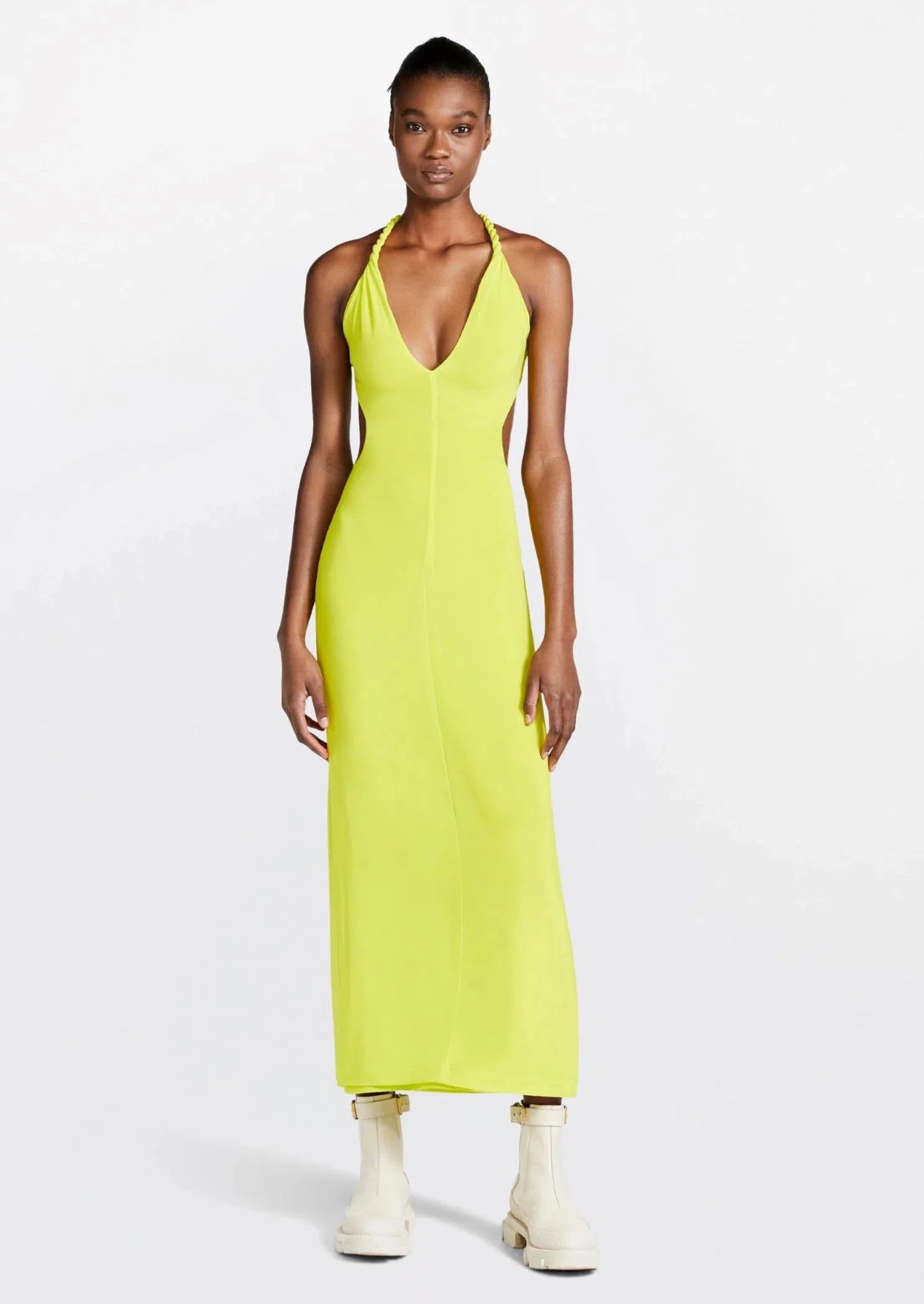 Sleeveless full length halter dress with twisted cord open back detail in a lightweight crepe jersey. V-neckline, rope cord straps and cut-outs at waist. Fabrication has stretch and drapes effortlessly over the body for a flattering slim silhouette.