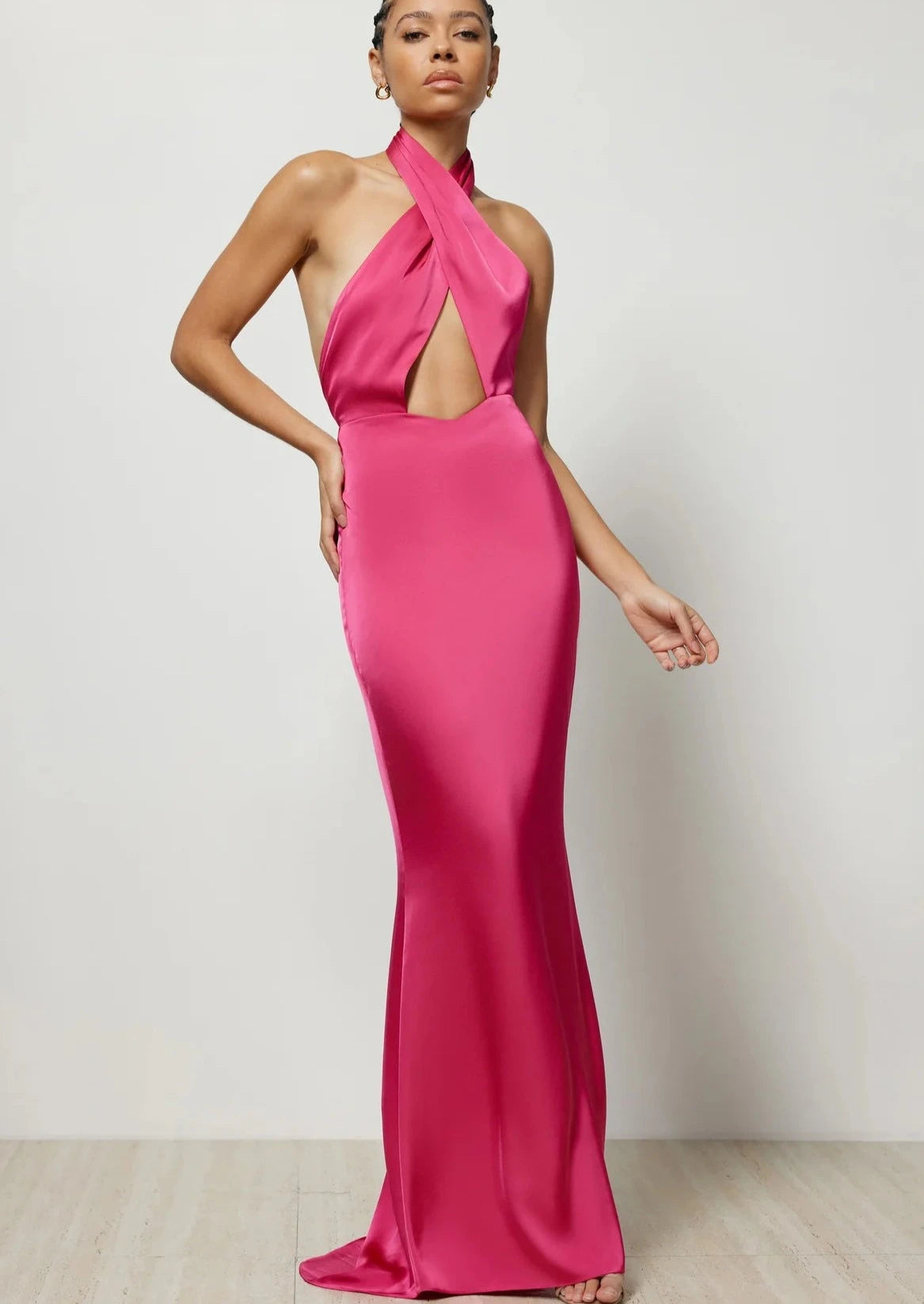 The Fay Dress crafted from luxe satin, features a sexy cross over bodice with torso cut out, and dipped waistline. The elegant soft mermaid skirt flatters the body and eventuates down into a small puddle train. The halter neck style fastens at the back neck, showcasing the bare back.