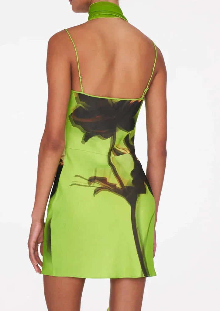 Crafted from a semi-sheer georgette layered over a fluid satin crepe slip, the dress is accented with our signature cowl and barely-there straps. Finished with the dark romance of an oversized floral motif set against a backdrop of fresh and zesty green.