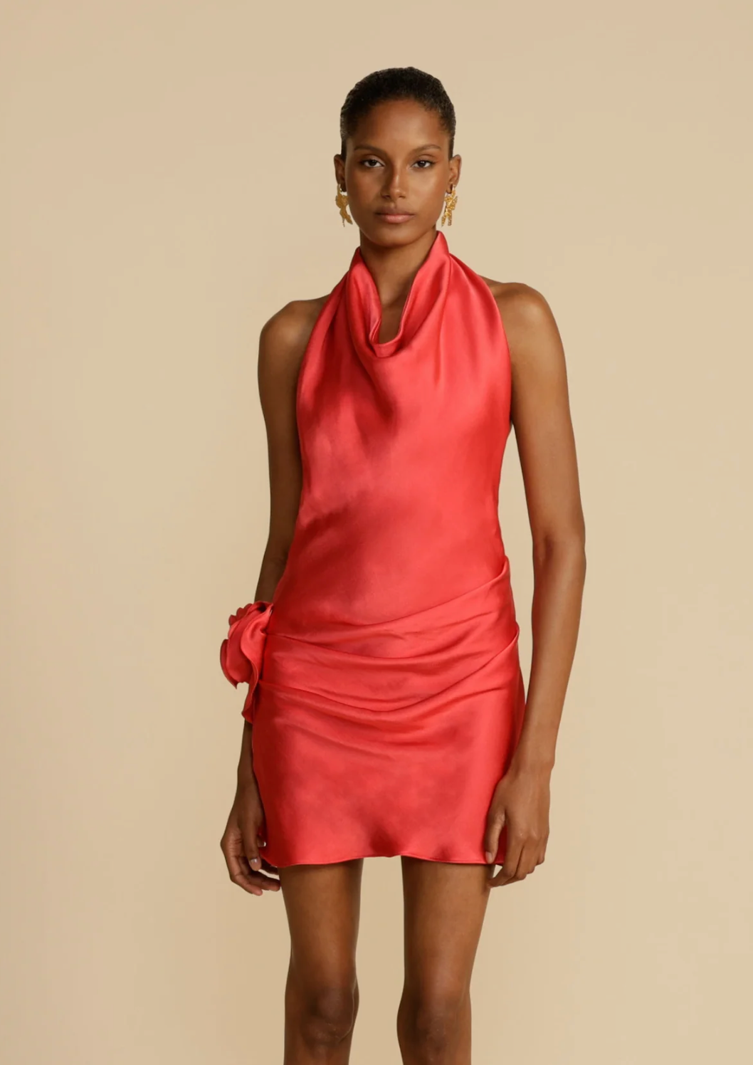 Introducing Rosa, a flirty statement crafted in a vibrant punch hue. Detailed with a plunging open back and full cowl neckline, intricately secured by a button closure. Designed for effortless elegance, Rosa features intricate ruching at the hips to embrace the feminine curves. Adding a playful and stylish finish, a hand-tacked silk touch rose sits gracefully on the side. For finishing touches, pair her with a neutral pump, and some classic gold jewels. Rosa is a sensual mini made for everlasting cocktail hours.