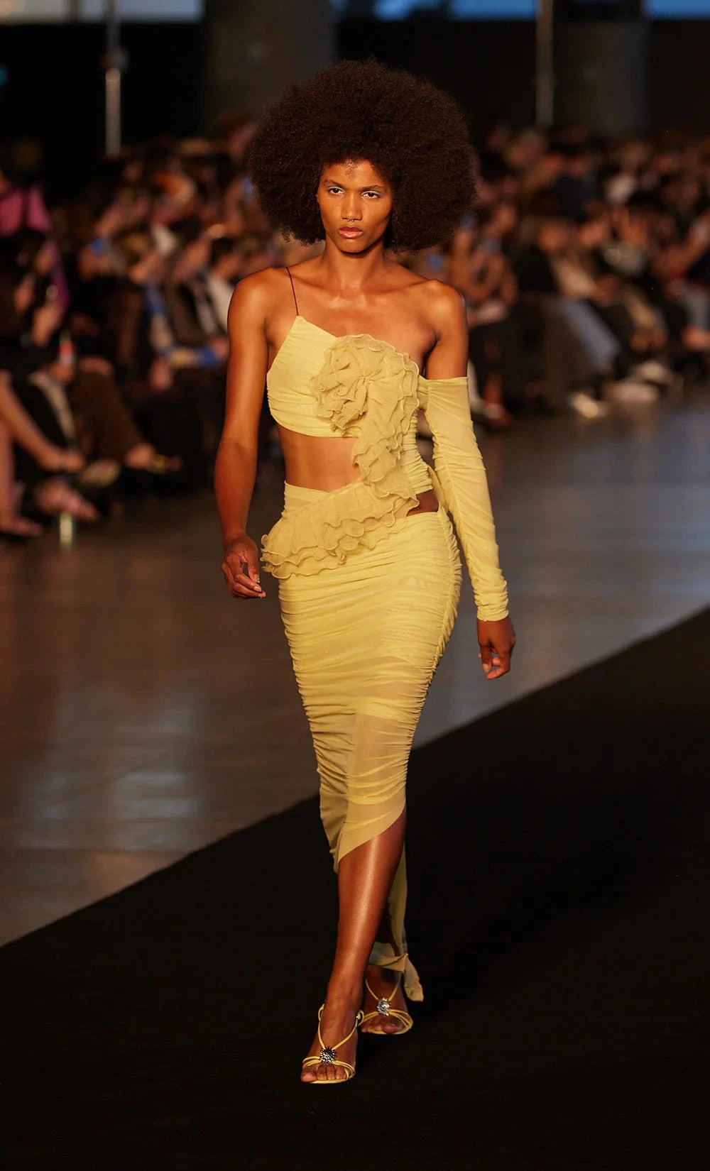 Make a statement in the Spiral Crush Asym Maxi Dress, crafted from a soft mesh fabric in citrus yellow. The dress features an asymmetrical neckline, thin cord strap, off the shoulder long sleeve, cut outs at waist and hips and statement spiral ruffle that cascades down the centre front, wrapping around the back. Dress is detailed with heavy gathering throughout, ruching down both side seams and split at side seam.