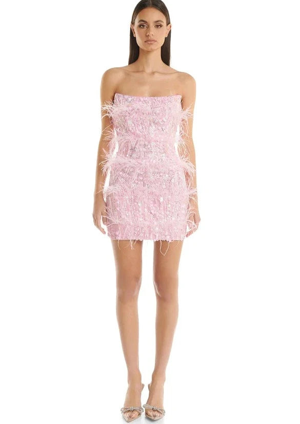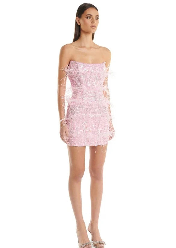 The Tiffany Dress designed in embellished sequin features a shaped neckline and figure hugging mini silhouette. Complimented with rows of pink ostrich feathers and complete with lining and a centre back exposed zipper closure. The Tiffany Dress is a fun and alluring party piece perfect the summer season.